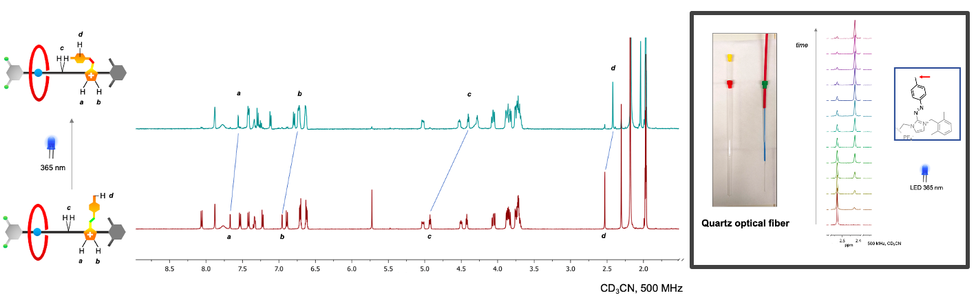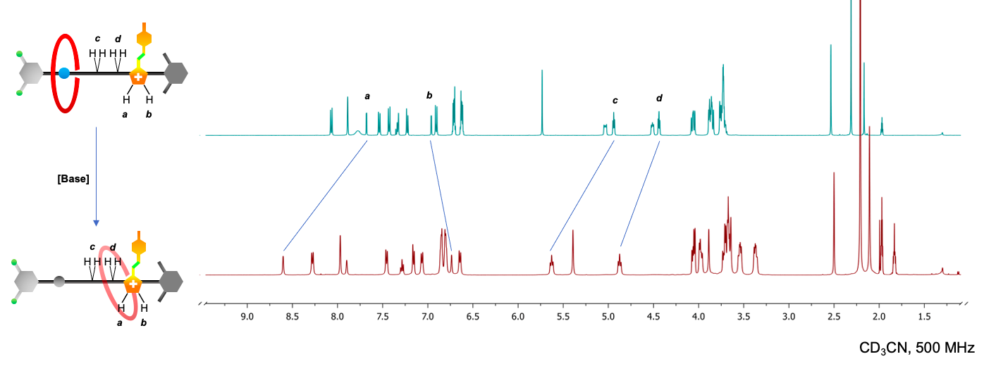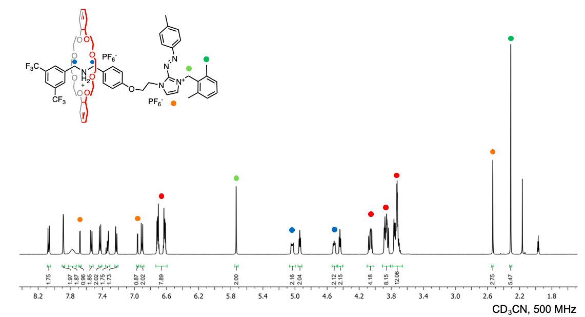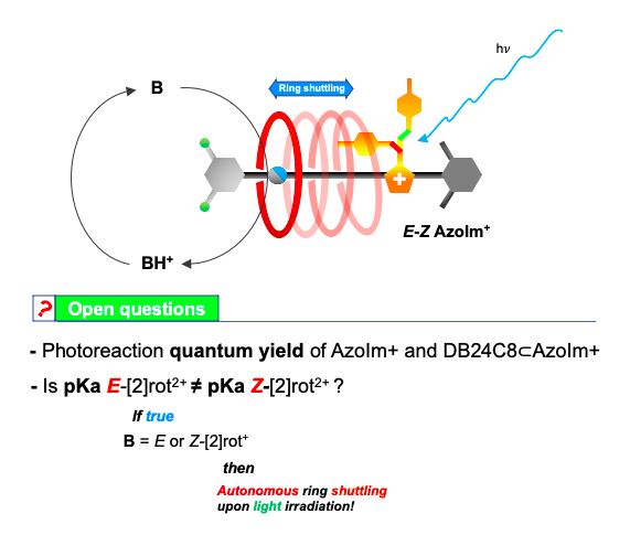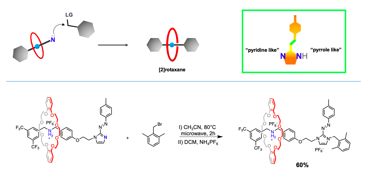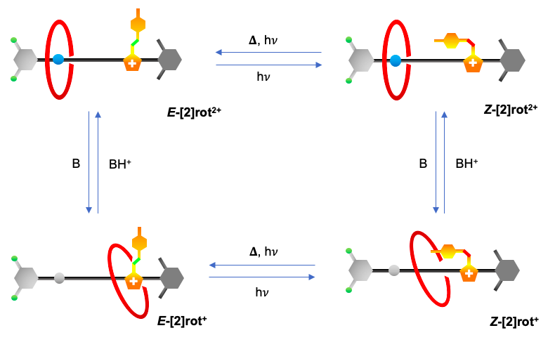 The reported rotaxane ([2]rot2+) is composed of a stronger ammonium station (Am+) and a novel, weaker phenyl azoimidazolium station (AzoIm+).